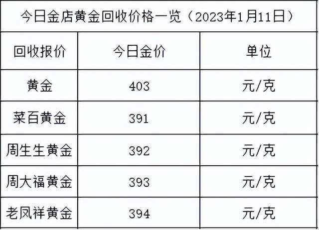 今日金价微涨,黄金回收价格也是微涨,涨幅为1元/克。同时,每个品牌的回收价格也不一样,小金大致整理了几个,详见下表,数据仅供参考: